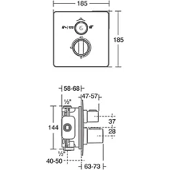 Built-in thermostatic shower bath mixer valve with a square faceplate. Ceramic disc flow control and adjustable temperature limit. Fits into a 43mm wall cavity and features double sealing for water tightness.