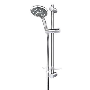 Stylish shower kit with rub-clean head and adjustable top bracket.
